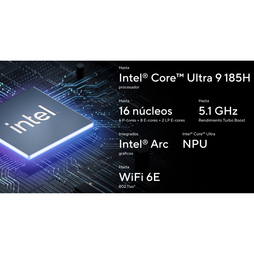 – Procesador: Intel Core Ultra 9 285H 2,9 GHz (24 MB de caché, hasta 5,4 GHz, 16 núcleos, 16 subprocesos)