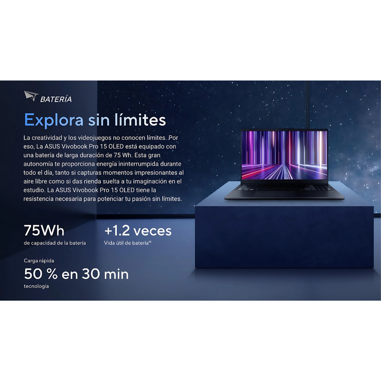 ASUS Vivobook Pro 15 OLED ofrece un rendimiento excepcional para creadores y jugadores profesionales. Potencia la creatividad profesional, mejora tu estilo de vida y te sumerge en el mundo de los juegos. Entre sus características más destacadas se incluye la pantalla ASUS Lumina OLED 3K 120 Hz de 15,6 pulgadas más avanzada del mundo 1 , hasta la última tecnología procesador Intel Core Ultra 9, y el más alto rendimiento NVIDIA GeForce RTX 4050 GPU
