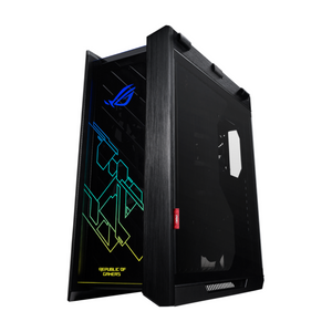 El ROG Strix Helios es un chasis de media torre para gaming con tres paneles de vidrio templado, estructura de aluminio e iluminación RGB integrada en el panel frontal. La organización interna del cableado y la cubierta multifunción con soportes de GPU ayudan a mantener el interior ordenado. Diseñado para soportar placas base EATX y configuraciones profesionales de refrigeración por agua, este chasis una opción perfecta para montar equipos ROG de exhibición.