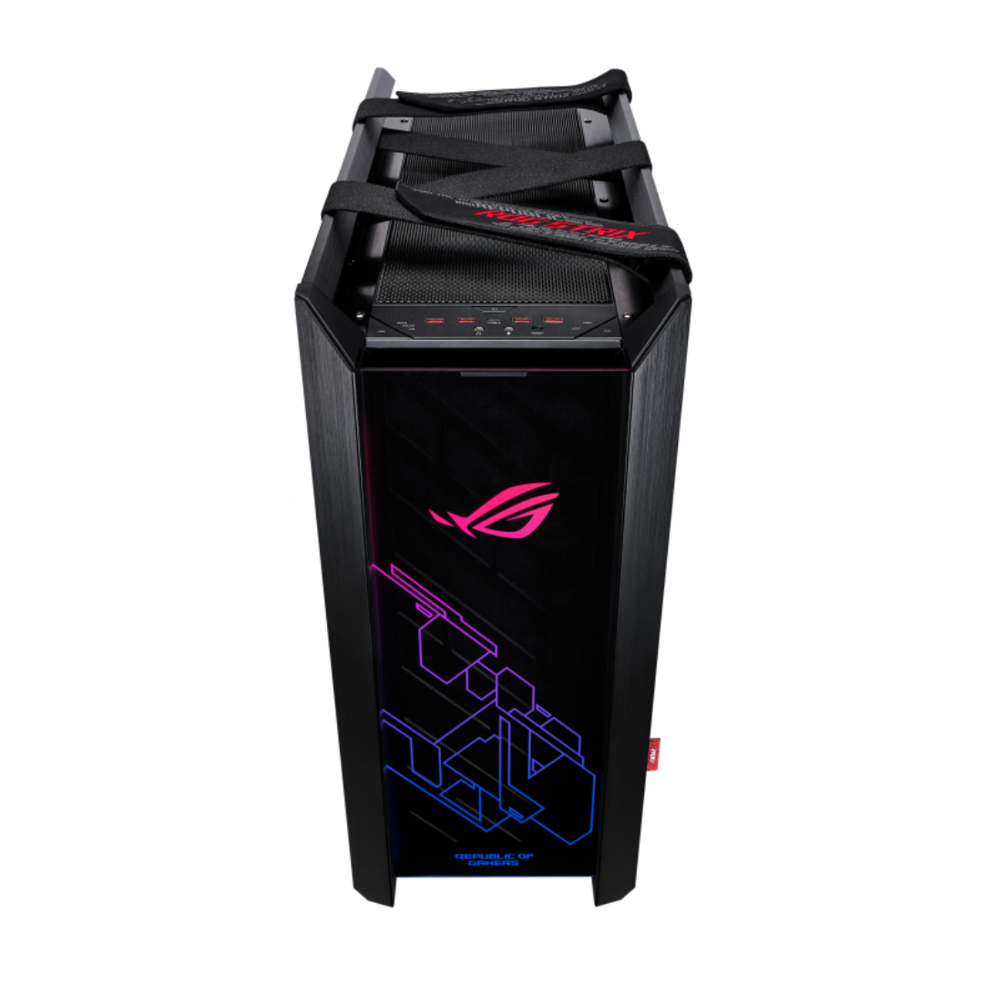 La iluminación LED RGB del panel frontal se puede personalizar con el botón de control o el software Aura. El ROG Strix Helios se puede personalizar con millones de colores y una gama de efectos que puedes sincronizar con un amplio ecosistema de componentes compatibles.