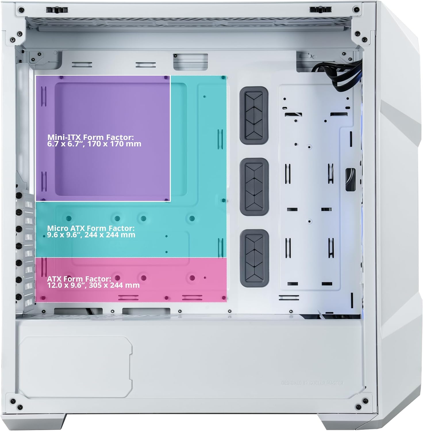 MasterBox TD500Mesh V2 es compatible de forma nativa con placas base ITX, M-ATX y ATX. Las placas base E-ATX, como los modelos SSI-CEB, son compatibles con dimensiones de hasta 30,5 x 27,9 cm.