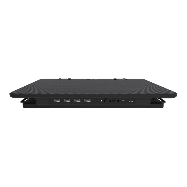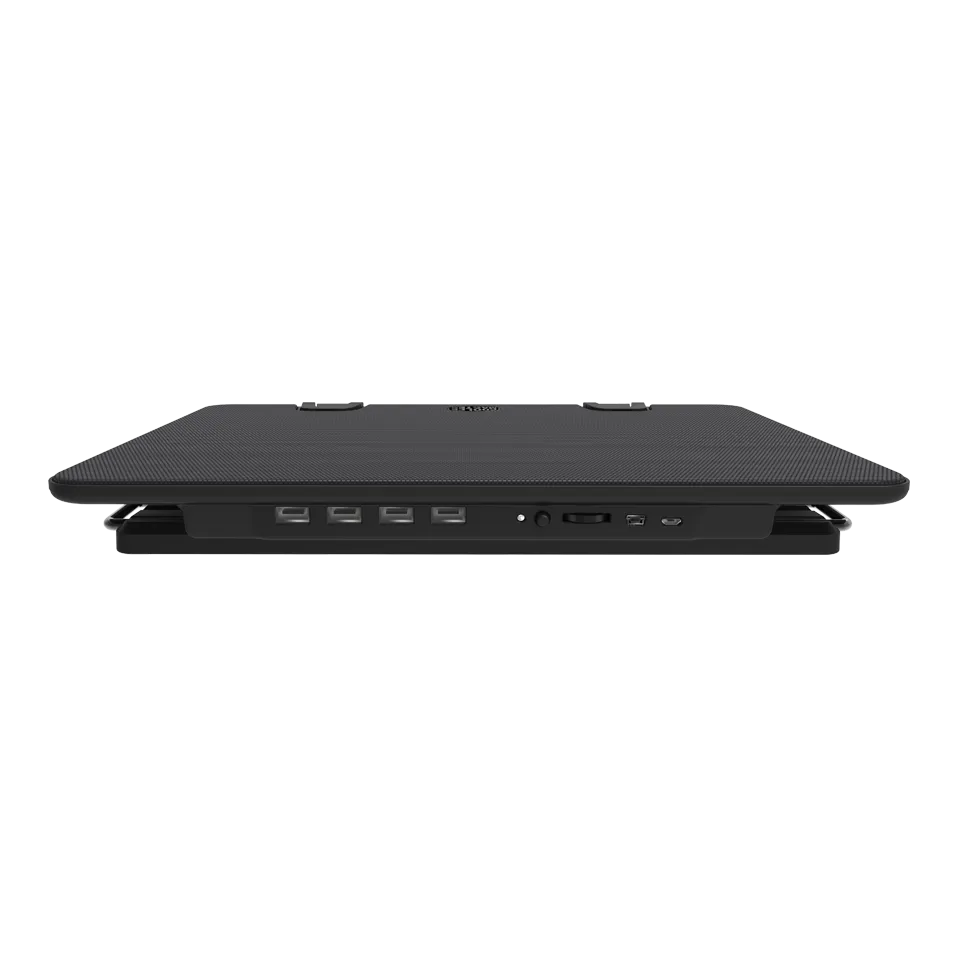 Un ventilador de 140 mm, diseñado para ser silencioso, mantiene su computadora portátil fresca y funcionando sin problemas.