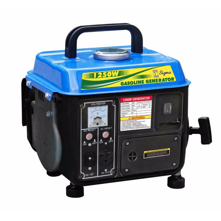 El generador eléctrico Sigma SG1250 es una solución confiable y portátil para respaldo de energía. Con una potencia de 1250W y frecuencia de 60 Hz, este modelo compacto ofrece una salida de CA de 120V y una salida de CC de 12V, ideal para dispositivos y herramientas pequeñas. Su motor refrigerado por aire, de 2 tiempos y 63 cc, proporciona 2 HP de potencia y utiliza una mezcla de combustible y aceite de 50:1.
