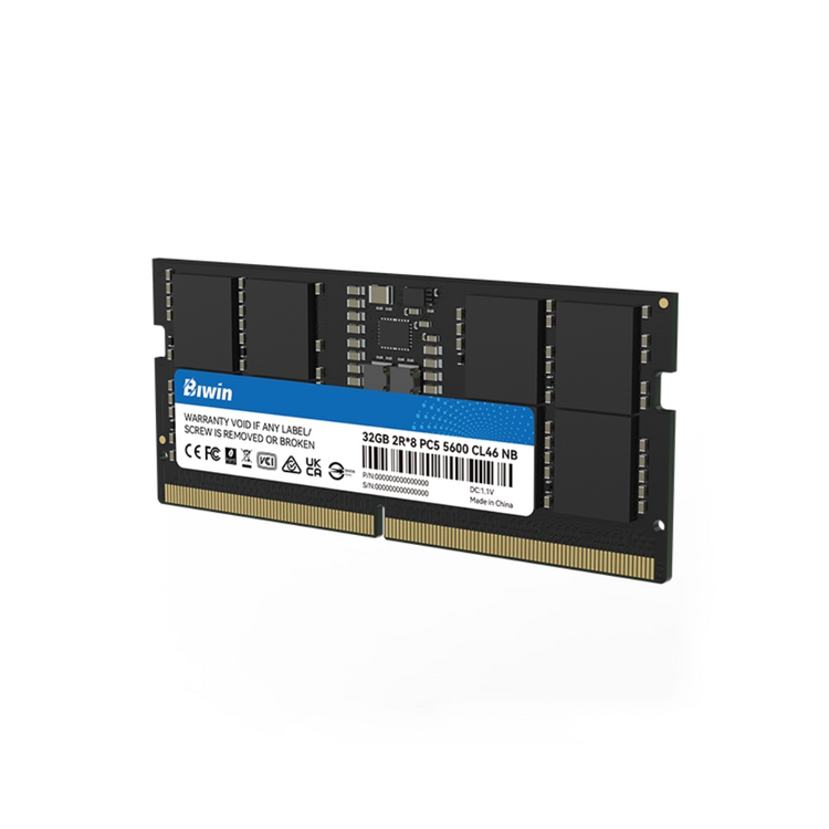 Compatible con portátiles y mini PC (NUC) DDR5 de gama alta, la memoria Biwin RS200 DDR5 presenta un diseño y un grosor más reducidos que los módulos DIMM estándar. Con velocidades de datos de hasta 5600 MT/s, Biwin incorpora la nueva tecnología DDR5 en la memoria RS200 para que trabajes más rápido, ejecutes más aplicaciones simultáneamente y disfrutes de mayor capacidad. La corrección de errores ECC en la matriz y los circuitos integrados premium seleccionados permiten a la Biwin RS200 ofrecer transferencias de datos más estables y una mayor fiabilidad. Disfruta del rendimiento mucho mejor de tu portátil o NUC, con su impresionante aumento de velocidad, ancho de banda y capacidad, sin preocuparte por el consumo energético. El voltaje de funcionamiento es de tan solo 1,1 voltios y el consumo de energía (gracias al PMIC) es aproximadamente un 20 % inferior.
