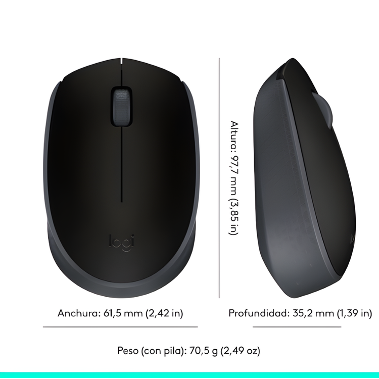 • Dimensiones del Mouse (longitud x anchura x altura): 97,7 x 61,5 x 35,2 mm