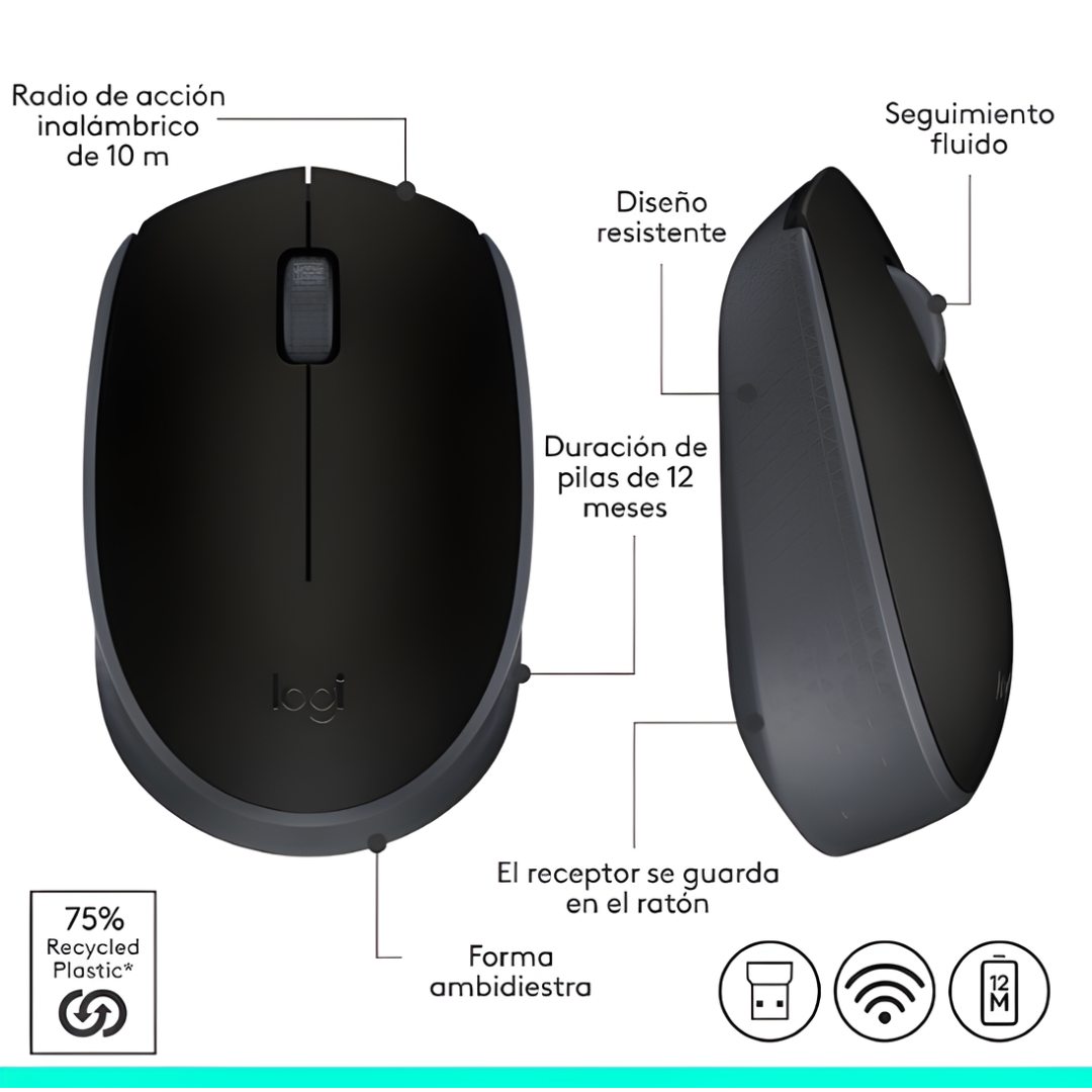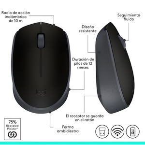 Gracias al desplazamiento línea por línea y al sensor óptico, el mouse M170 Logitech tiene un control del cursor uniforme y preciso en casi todas las superficies.
