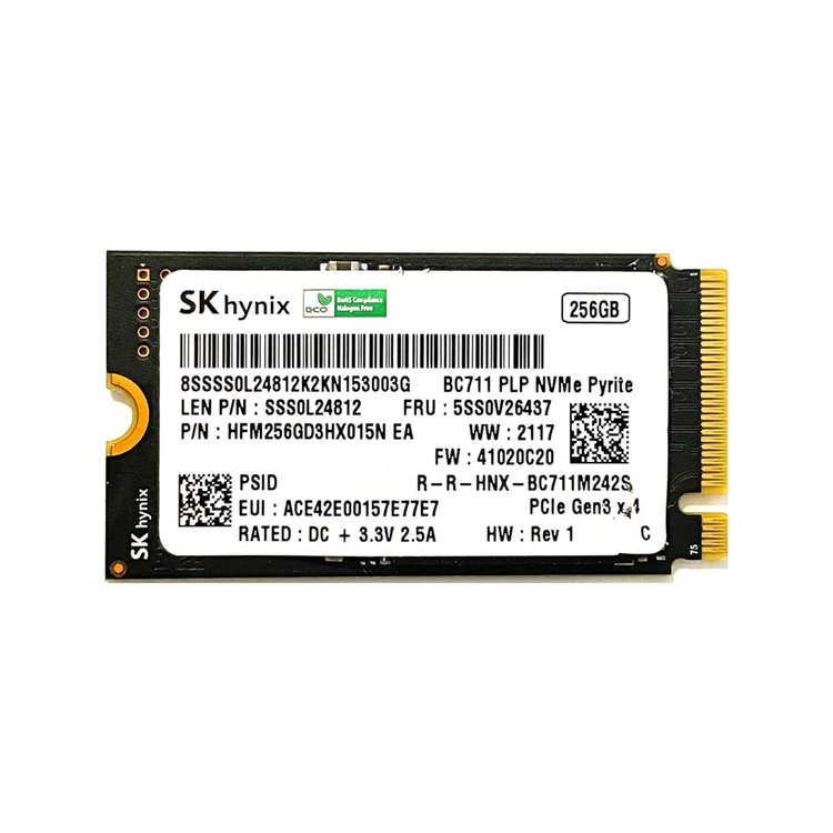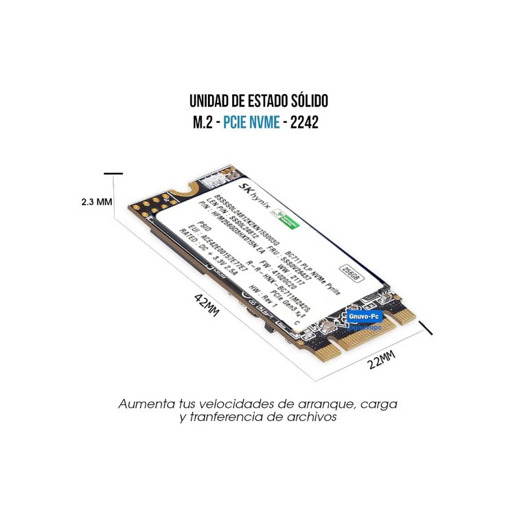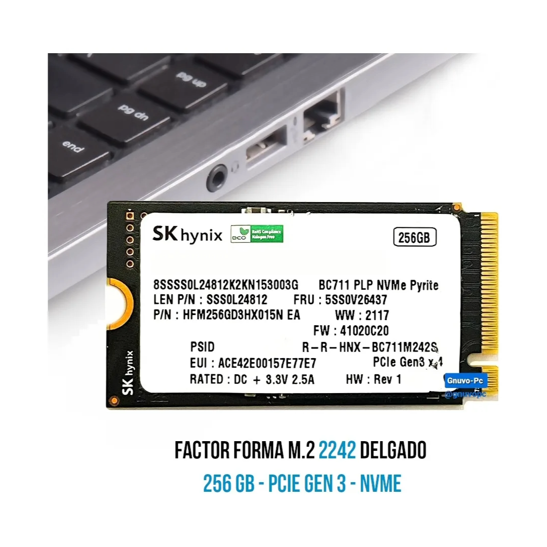 Fabricante: SK Hynix Capacidad: 256GB Forma: M.2 (m2) Factor: 2242 Tecnología: 3D NAND TLC (Nueva Generación) Tecnología: Nvme 1.4 (NO SATA)Interfaz: PCIe Gen3 x4 (Retrocompatible con PCIe 2) Velocidad Escritura: 1200 MBs Velocidad Lectura: 2200 MBs MTBF: 1.7 Millones de horas Capacidad de sobreescritura: 100 TBW Peso: 5 g Dimensiones: 22 mm x 42 mm x 2.3 mm Certificados: BSMI, CAN ICES-3(B), NMB-3(B), CE, FCC, KCC, Morocco, RCM, TUV, UL, VCCI.
